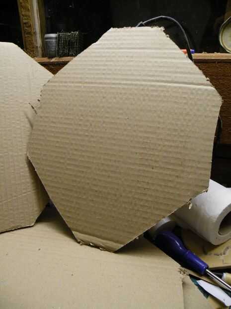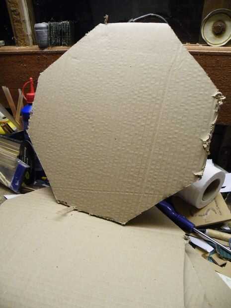 Tuve algunos grueso corrugado tarjeta *, demasiado gruesa para curvas suaves, así que decidí ir geométrica y hacer un truncado cubo - seis octaedros, en los planos de las caras de un cubo, con triángulos equiláteros en las esquinas.