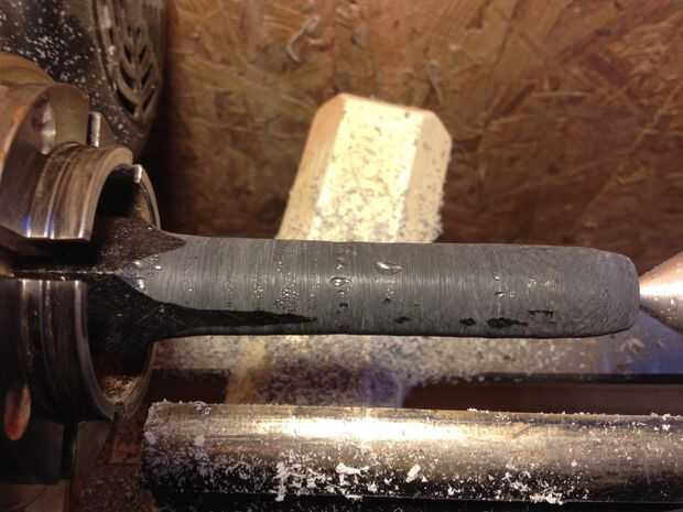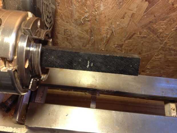 Me gusta usar simplemente las mordazas interiores pequeño en mi tirada a las superficies planas de la blanco en un extremo del gancho agarrador (a partir de una sección cuadrada en blanco, véase la segunda imagen) y la guarnición hasta el otro extremo del blanco a un centro vivo en el contrapunto. Si usted no está familiarizado con torneado sintético y sintético en blanco para activar, Echale un http://rhinoplasticblanks.com/tips.html para algunos consejos de torneado. Realmente no se preocupe acerca de cómo el espacio en blanco hasta un cilindro perfecto en este punto porque resulta fácil eliminar accidentalmente demasiado material en el proceso. En general, sólo me gusta los cantos constantemente sobre el eje de giro.