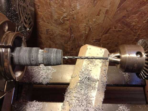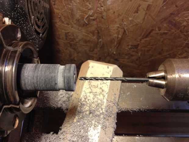 Ahora, usted notará que la mayoría de 3/32" brocas (incluido el mío) son bastante cortos... De hecho, demasiado corto para hacerlo a través de la barra entera. Por eso corté dos muescas de centrado: después de fondo la broca en este lado de la varilla de vástago, retire la varilla del vástago de la tirada y vuelta, las mordazas pequeño en la ranura de la espiga de sujeción así que puedo completar el agujero del otro lado (visto en la segunda foto de este paso). Otra vez, por esta razón es tan importante mantenerlo centrado (para que los dos agujeros se cruzan). También podría notar que Deslice la broca hacia arriba en el mandril para darme más largo para trabajar con. Puede comprobar un agujero completo por soplar en la barra... esto puede también izquierda de eliminar los residuos de perforación.