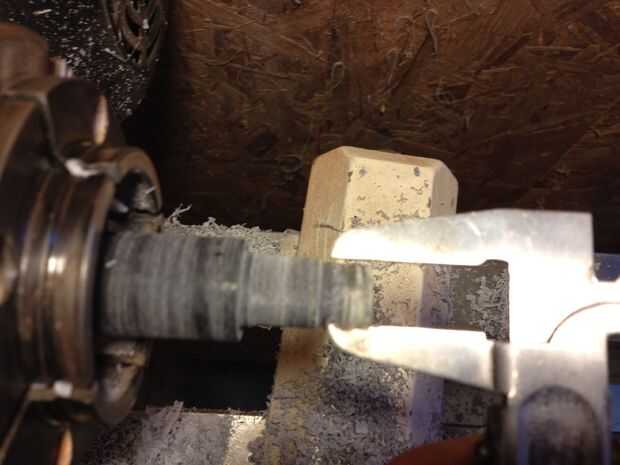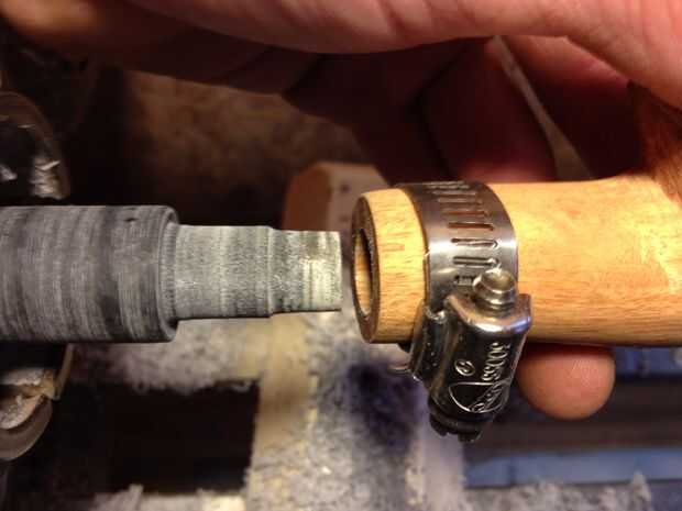 Me gusta hacerlo en una manera stepwise, primera medición del diámetro de la mortaja con un calibrador y extracción de materiales a lo largo de la longitud de la espiga entera hasta que queda un poco demasiado grande para caber a través de la pinza (segunda foto). Después de esto, lenta y cuidadosamente afeitado algunos materiales desde el último centímetro o así de la espiga, parar el torno con frecuencia para ver si se adapta a la espiga en la mortaja (tercera imagen). Una vez que el extremo de la espiga se adapta fácilmente y cómodamente en la mortaja, trabajo en el resto de la espiga--otra vez, parando con frecuencia para comprobar el ajuste. Ahora, finalmente llega a un punto donde puedo forzar la espiga más de la manera en la mortaja. Que es cuando pongo lejos el cincel para sesgar y uso lija de grano 80 para quitar menos material para que accidentalmente no dejo la espiga demasiado estrecho (tercera imagen). Compruebe, entonces utilice 120, compruebe, entonces 220, etc. hasta que estoy contento con lo bien encaja, no muy apretado por lo que tiene ser forzado, pero lo suficiente para evitar resbalones sin torcer primero apriete (Cuarta imagen).