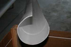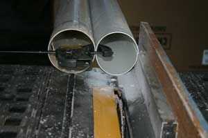 ESA es la derecha!, es hora de empezar la medición, marcado, corte, lijado y admirando! algunas de las tuberías tienen que cortarse porque son lo que sostiene la lona, incluso en el tiempo más ventoso. Para ello la mitad de los tubos tiene que ser cortado para crear una ranura de 2 1/2-3 pulgadas. Esto es suficiente para permitir que se coloque sobre el otro tubo de 4" y no rasgar el forro de plástico. Para mantener el corte algunos recto, sujeta otro tubo de PVC que por lo que no se girar. Esta operación tomó un tiempo, 18 tubos significan 36 cortes en la tabla VI.
