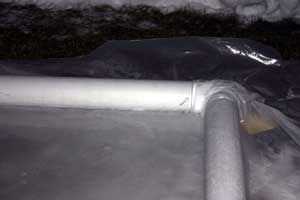 Añadir el trazador de líneas (tarp) primero colocar el forro plástico de 6 mil sobre la parte superior de la estructura de PVC y luego rompieron la tapa de PVC sobre el forro de plástico. La tapa ofrece un duelo, sosteniendo la funda en su lugar y proporcionar protección contra skate hojas. En esta foto puedes ver por qué el forro tiene que ser más grande que el marco. 4 pies adicionales en los lados es suficiente para no perder los lados.