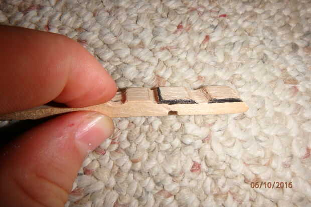 Alisa la parte delantera de la pinza de ropa medio. Yo he marcado el parque para cortar en negro. Es mejor hacerlo con el xacto, pero si la Sierra es bastante pequeña, que va a funcionar. El punto de esto es hacer una ruta suave para el BB viajar hacia abajo.