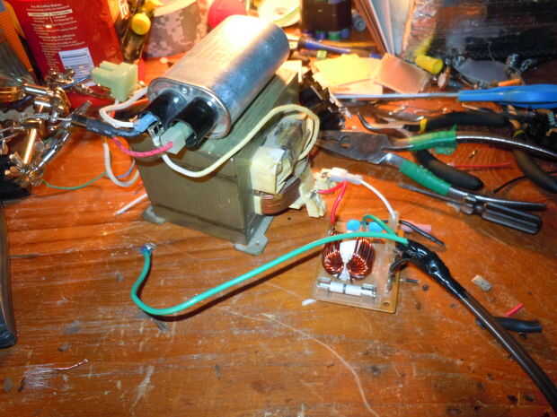 El im de microondas utilizando para hacer esto tenía un papel en él con esquemas de todo así que me uno a la pintura de lo que necesitaremos, también podrá incluir un filtro de ruido si desea utilizar uno. Los pernos en el filtro deben ser etiquetados "L" y "N", debe haber dos de cada clase, dos de entrada dos de salida y un cable verde de tierra. En la toma de corriente (en América) el orificio izquierdo (uno más grande) es neutral y el orificio del lado derecho (uno más pequeño) está vivo y medio es, ahora que conoces este cable el filtro. Conecte la salida para el lado primario del transformador de alto voltaje. Hay dos devanados secundarios en el transformador, el pequeño se llama el "calentador" y su uso para el calentador de magnetrón, éstos son generalmente alrededor de 3V @ 15A. La bobina más grande es el lado de alta tensión, generalmente tiene una salida de 2kV @ 500mA y te matará al instante, estos se utilizan para la producción de las microondas, te darás cuenta hay solamente un cable para esto, el otro está conectado a la base de hierro. Tome el cable de alta tensión y conéctelo a un lado de su condensador, en el otro lado Conecte uno de los cables del calentador, el diodo y un cable para ir al magnetrón. el otro cable en el diodo debe conectarse a tierra así como el caso del magnetrón y el núcleo del transformador.