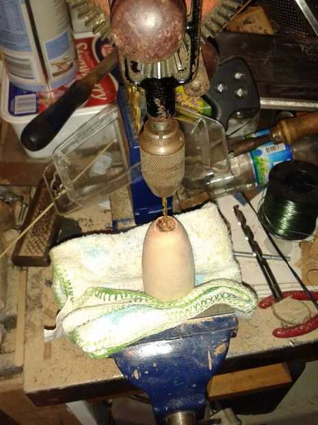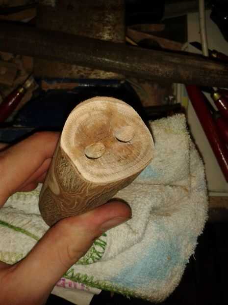 Lo siguiente que hice, era marca y perfore los orificios para la espiga sirve para conectar el mango al cuerpo, tenía que ángulo un poco así que asegúrese de que usted está usando el mismo ángulo para ambos agujeros en ambas piezas de madera, también Asegúrese de que los agujeros estén a la misma distancia aparte, sabes , sentido común básico y esas cosas. Después de un poco de ajuste, los tacos estaban listos para ser pegado en lugar.
