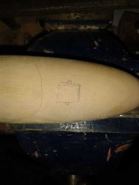 A continuación, cincelado un agujero para encajar el gatillo en. Empecé dibujando el contorno del agujero, observe las ranuras pequeñas en los lados, eso es para la espiga en el gatillo para pivotar en. Luego perforé varios agujeros dentro de ese esquema para empezar el cincelado. Después de probar un poco y pude ranuras de ajuste el gatillo justo en el lugar y estaba trabajando justo cómo tenía la intención de trabajar.