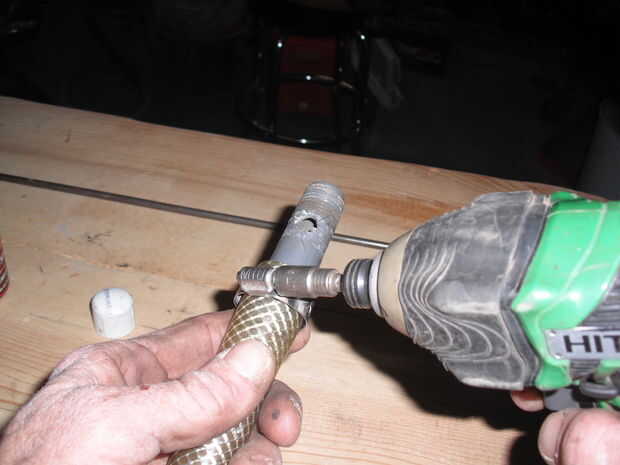 Perfore un orificio de 3/8" de en medio de la pequeña rosca pvc. Esto es donde el cañón se fije. Seguro ahora esta pieza de pvc en el tubo de cámara utilizando una abrazadera de manguera. He usado parte de mi tubo de tanque de gas de moto. Fue lo único que podría encontrar en mi garaje, pero resultó para ser lo suficientemente fuerte. Ahora Conecte el otro extremo a la parte delantera de la pistola o boquilla de aire con la otra abrazadera de manguera.