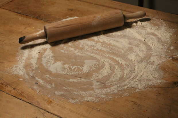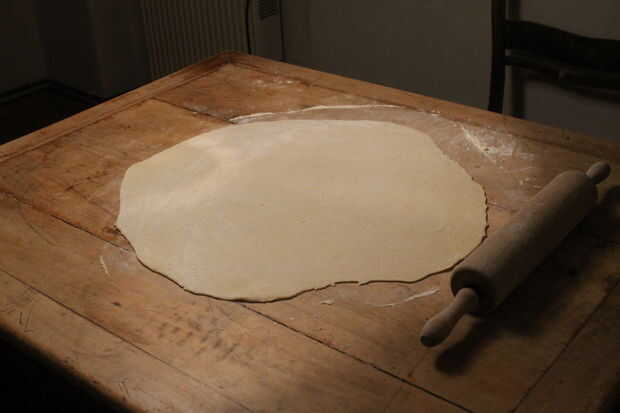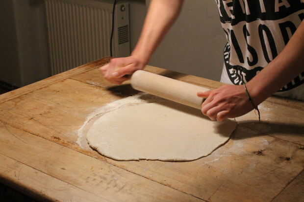 Para estirar la masa que necesita para asegurarse de que cubre la superficie que utilizas para extender la masa con la harina primero. De esta forma la masa no se pegue a la superficie de la mesa. También poner harina en el rodillo, para que la masa no se pegue en el rodillo. Domesticar a la masa y poner sobre su superficie. Use el rodillo para aplanar la masa. Gire la masa alrededor de una vez y entonces, para aplanar de ambos lados y eso él no se pegan a la superficie.