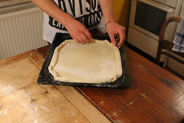 Después de haber desplegado la masa hasta que esté lo suficientemente grande para cubrir la bandeja del horno, o lo suficientemente delgada, la masa y coloque en la bandeja para hornear. Use sus manos para doblar los bordes de la masa, para que crear una costra. Entonces estás listo para poner el relleno en la pizza.