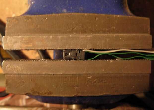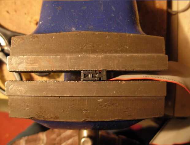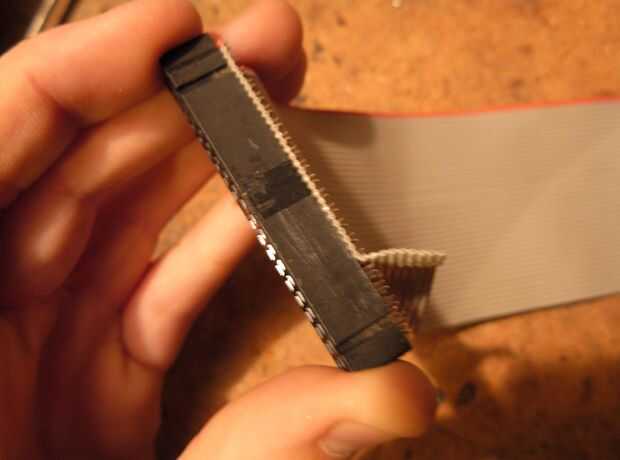 La primera tarea es sacar los cables de los cables IDE. Ayuda a poner los cables en un vicio para este paso. Si te fijas en los extremos de los cables, notará una pequeña pieza de plástico sujetando los cables. Para quitar esto, puedes intentar haga palanca y retire los pequeños triángulos en los lados, pero encuentro que es mucho más fácil hacer dos pequeños cortes a cada lado que la pieza soporte derecho a sacar. (los cuadros le mostrará lo que quiero decir) A continuación, debería poder solo Pele los cables de la cabeza. Puede guardarlas para otro proyecto, pero no necesitas más para éste.