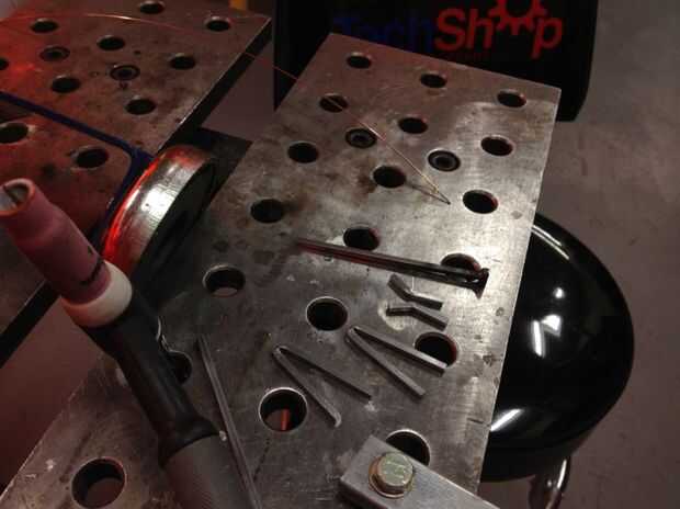 Primero soldó con autógena el pequeño 1/4" piezas a una pieza más grande (que se convertiría en el mango) para hacer la cabeza. (I brevemente