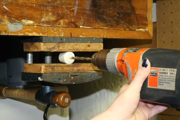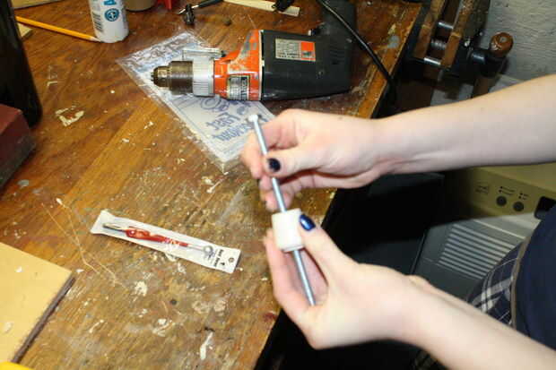 2) Inserte el tornillo. Queremos la punta para poder girar libremente así que tenemos que insertar algo para mantener el epoxi de unión con el bulón. Cosas una arandela en el caucho de punta que pone plana contra la cabeza del perno.