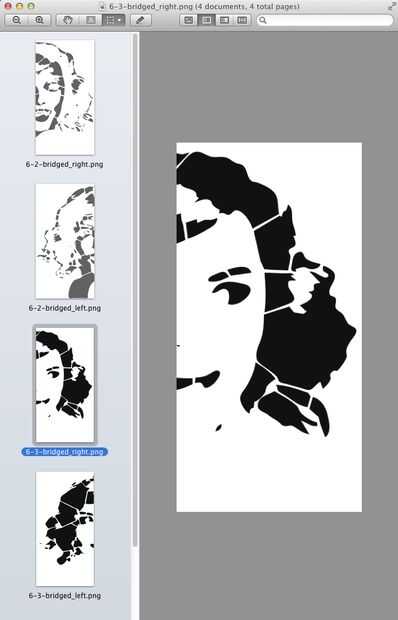 Imprimir las imágenes del puente de la plantilla. Que desea imprimir con el mismo tamaño que desea que la plantilla sea. Tienes que imprimir todas las capas con el mismo tamaño. Quería hacer una plantilla que era un poco mayor que 8.5 "x 11", así que imprimió la mitad izquierda de la imagen y la mitad derecha de la imagen y con cinta juntos en el siguiente paso. Hay algunos servicios en línea donde usted puede dividir una imagen en múltiples componentes. He estado usando la aplicación de escritorio de Picasa.
