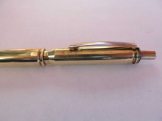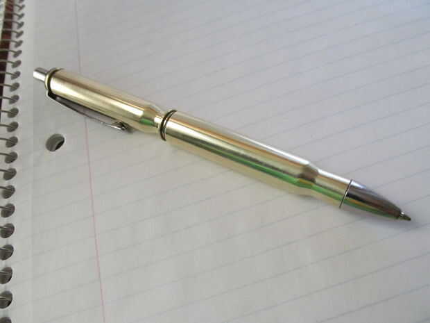 esta pluma hace un gran regalo único. Se realiza mediante dos percutidos de rifle 30-06 para reemplazar el cuerpo de la pluma de un clic. Es un divertido proyecto, que le llevará aproximadamente una hora para completar. Lo que no ves aquí o en el video es cuántos percutidos y horas que se tardó en averiguar el proceso adecuado para esta pluma. Así que si usted pruebe su suerte en esto no se desanime si tarda un par de intentos.
