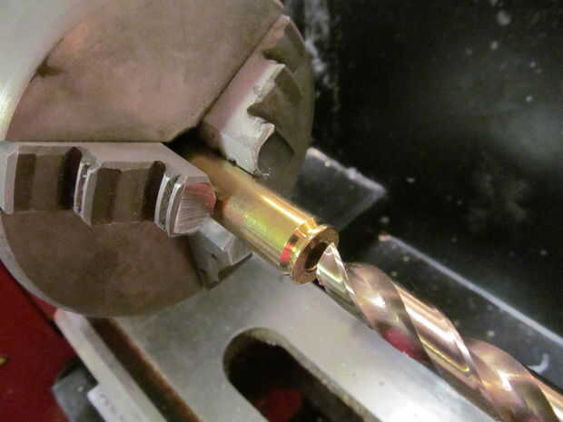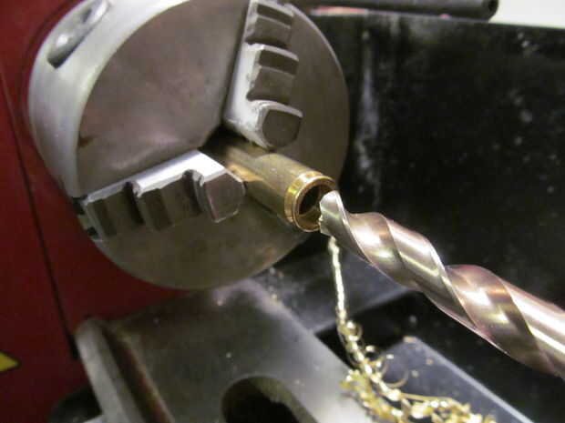 Tendrás que perforar por los extremos de la cartilla de ambos percutidos. Usé un mini torno de metal con una broca de 11/32 arrojó en la pluma de la cola. Puede usar un taladro normal pero la parte difícil es encontrar una forma de sostener la cáscara sin distorsionarlo. Una vez que tengas ambas conchas perforados hacia fuera, tendrás que ampliar los cuellos. Antes puede hacerlo necesita algunas medidas.