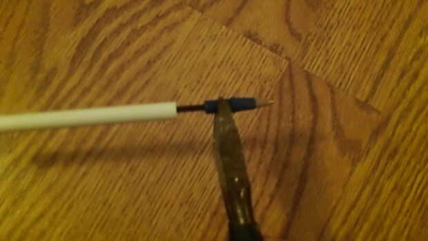 Como se muestra en la foto de arriba, tomar sus cortadores y meneo frente a la punta de la pluma.  Como este sale, el cartucho de tinta seguirá.  Ahora para que la cosa en la parte posterior.  Sujetador debajo y debe soltarse.  Quite esto y usted debe dejarse con un tubo de bolígrafo vacío.