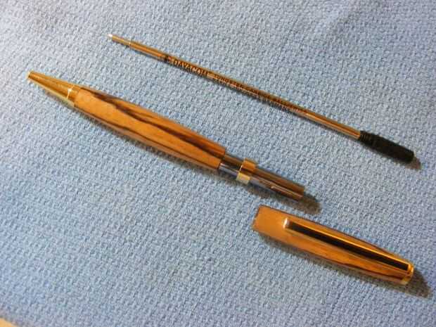Colocar la recarga de tinta según las instrucciones, deslizar la banda centro y luego deslice el cañón de la pluma superior (con montaje del clip/casquillo) sobre el mecanismo de giro.