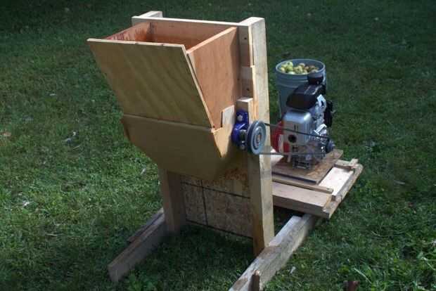 Mi vecino es Amish usan motores de gas pequeños en lugar de eléctrico y en este caso es un 100 de Honda que realmente hace puré en un apuro. Moler las manzanas solíamos ser la limitación de factor ahora tarda solamente 20 segundos para moler un cubo de cinco galones de la fruta a la sumisión.