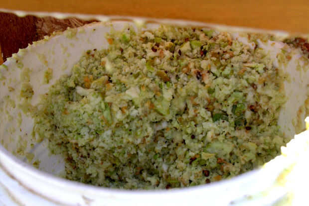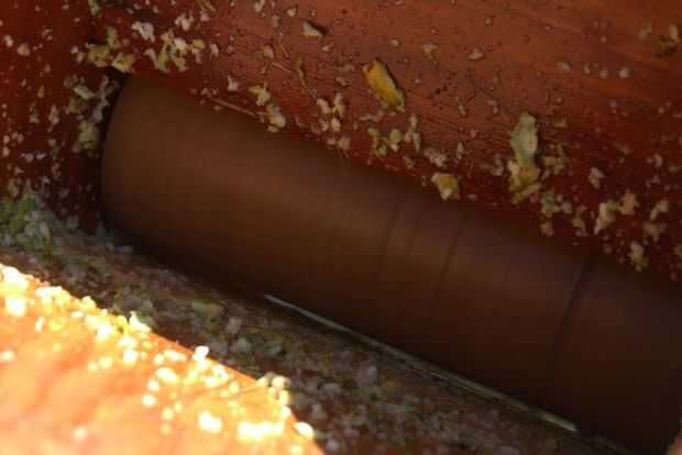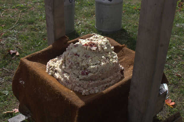 Aquí está la instalación de molino para moler las manzanas en un galón 5 negocios bucket y el puré se vuelca en la arpillera.