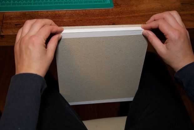 Corte un pedazo de papel o cinta de enmascarar ligeramente más corto que el lado corto de la parte inferior de la caja. Pintura de agua sobre la parte posterior de la cinta (si utiliza cinta de papel). Coloque la mitad de la tira de cinta en el lado corto de la parte inferior de la caja mientras está en una superficie plana. Entonces me parece más fácil para unir la parte inferior al lado utilizando una tabla como un 'molde' - agarre la parte inferior de la caja entre mis rodillas contra el lado de la mesa y usar mis dedos para alisar la cinta sobre el lado, que se encuentra encima de la mesa (ver foto). Porque los lados son 1/4" inferior de la caja, asegúrese de que los lados queden centrados (por lo que debe tener un espacio de 1/8" al final de cada lado) - esto es donde van a quedar los bordes de la caja larga.