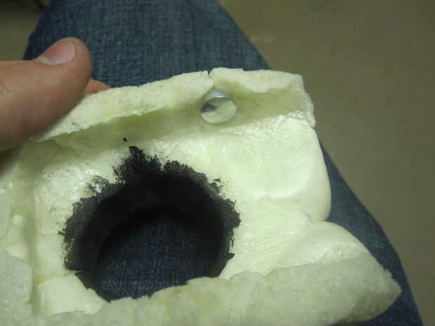 Haz un cilindro de plástico que es lo suficientemente pequeño como para empujar el botón de la cámara. Corte realmente corto por lo que toca tanto el interior de la caja y el botón del obturador de la cámara (cuando el camere está dentro del inserto de espuma, dentro de la caja).