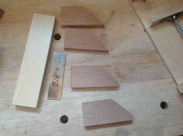 Para empezar necesita algo de madera, una placa de acero y una barra de metal o un clavo grande podría palabra al bien. Utilicé dos tipos de differend de madera pero no tienes que. Las dimensiones no son realmente importand puesto que usted puede hacer que quieras. El ángulo de corte a la madera oscura es 45 grados. Para la madera en la parte inferior de la imagen sobre que necesita quitar tienen una pulgada cuando están usando la madera no se atasca.