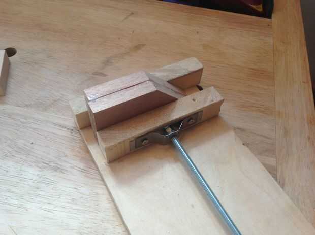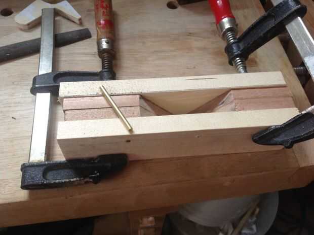 Pegar la madera como se muestra en las fotos. Cuando junto con medir el bloque así que puede cortar un trozo de varilla o use un clavo para sujetar el acero más adelante. También Perfore un agujero para la varilla o clavo como se muestra en la segunda foto