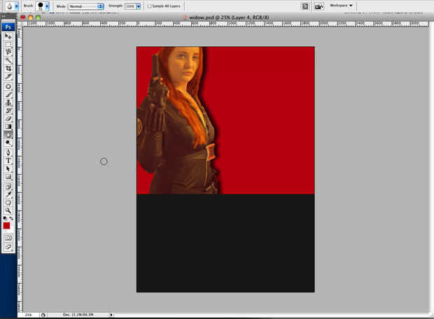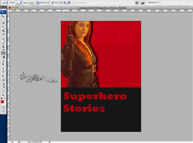 Para iniciar angustiante la tapa, elija un color ligeramente más claro que lo que usted quiere a señal de socorro. Usted puede bajar la opacidad del pincel, pero realmente puede jugar con ella. Para el fondo rojo, tuve la opacidad del pincel alrededor 30%. Para angustia el texto, puede utilizar el mismo pincel grunge con la herramienta Borrador, sólo asegúrese de que se establece en el texto, porque lo necesitará para la trama. También puede utilizar esto para angustia un poco la foto.