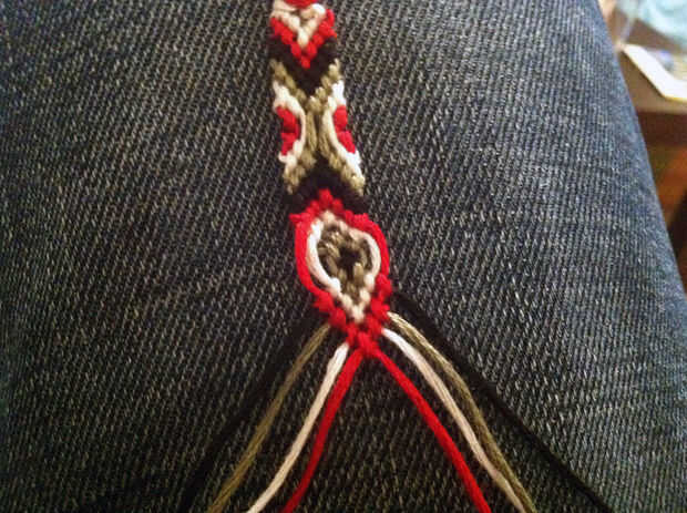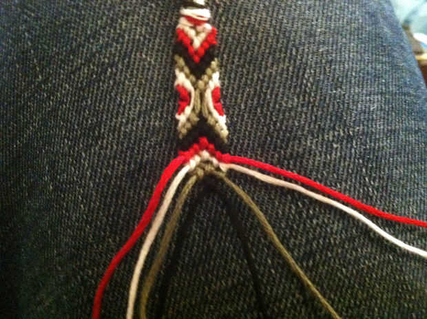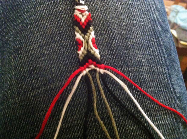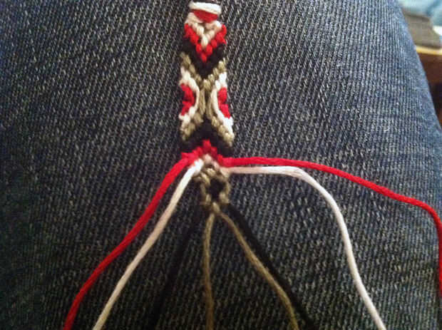 Atar las cuerdas rojas desde el medio hacia los lados de la pulsera, haciendo un forma de V al revés. Seguirá haciendo lo mismo con las secuencias blanco, pero no atar alrededor de su respectivo hilo rojo externo.