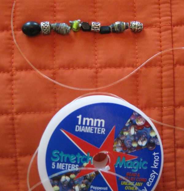 -Corte el cordón de abalorios en una pieza de 9-10". me gusta triple nudo cordón - para agregar un cable extra para asegurarse de que hay suficiente para empatar y luego cortar el exceso. Si usted está haciendo una pulsera para un niño o de la muñeca menor, ajustar el tamaño en consecuencia.
