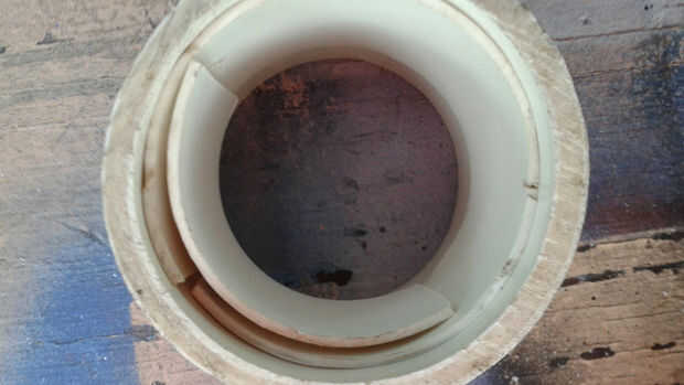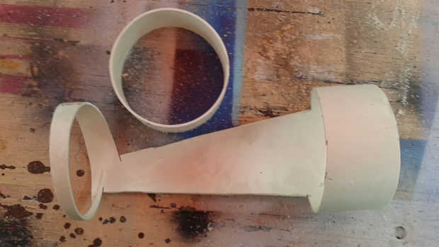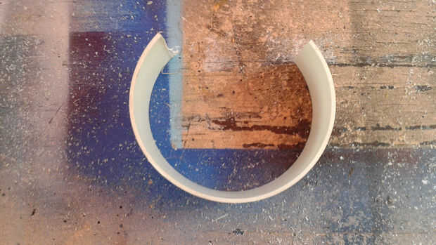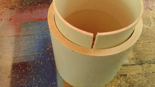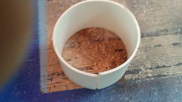 Quería crear una pulsera sólida, así que necesitaba una base para conectar los botones a. Cortar un anillo de un retal de alcantarillado amurallado delgado tubo de 4"(no se usa!). Este anillo era demasiado grande, por lo que recortar aproximadamente 2.5" de la circunferencia. Utilicé una pistola de calor para ablandar el plástico y ponerlo dentro de una pieza de 3" dentro de la pipa del diámetro se enfríe. Salió mucho más cercano al tamaño que necesario con suficiente izquierda sobre recortar exactamente más adelante.