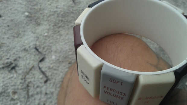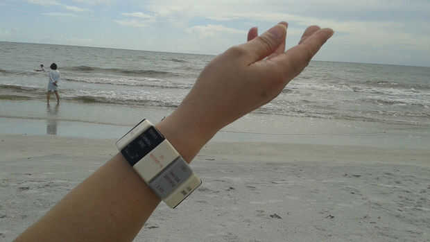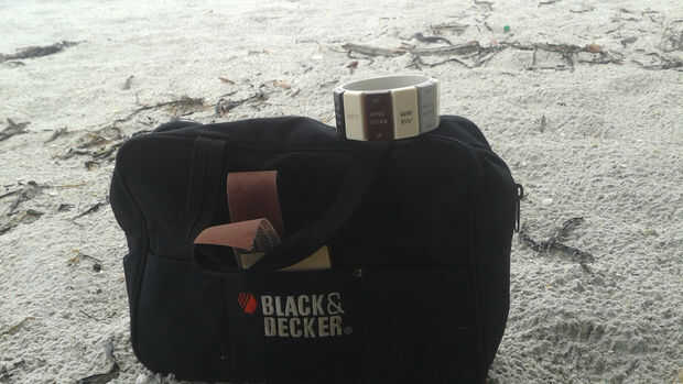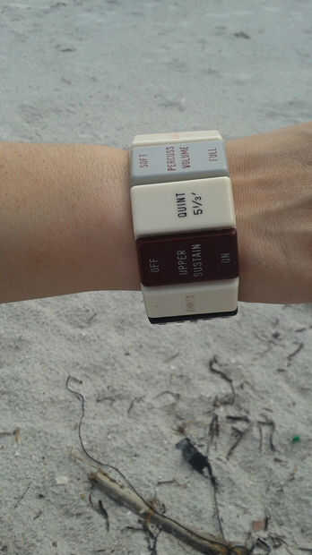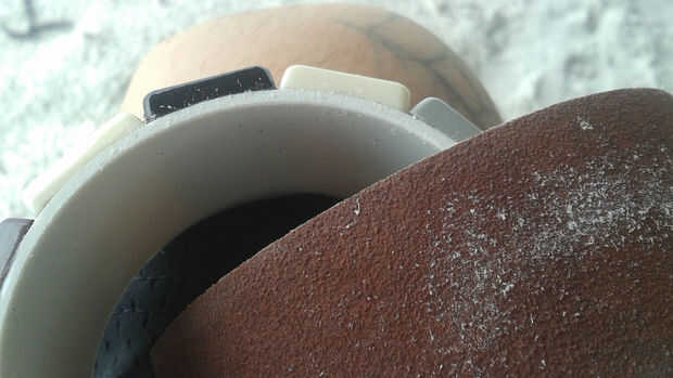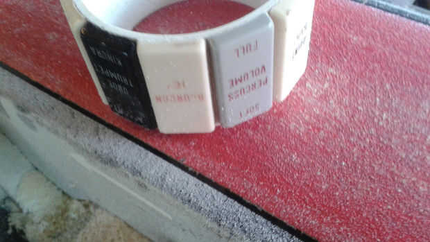 Íbamos a la playa ese día, pero proyectos esperan a nadie. Golpeó los bordes con la lijadora de banco que incluso ellos antes. Traje la pulsera y unos pedacitos de papel de lija con mí y pasó un poco de tiempo lijar suavemente el borde interior de la pulsera de PVC base sobre las esquinas afiladas y suavizar la articulación donde se unieron la base del PVC. Comencé con un papel de 100 grano y alisadas con unas 150 y 220. Le di a mi modelo de esposa/de la mano y ella le dio su sello de aprobación!