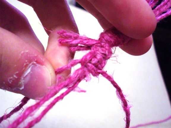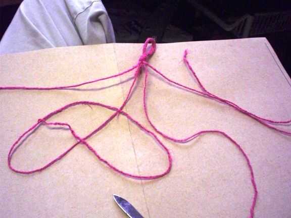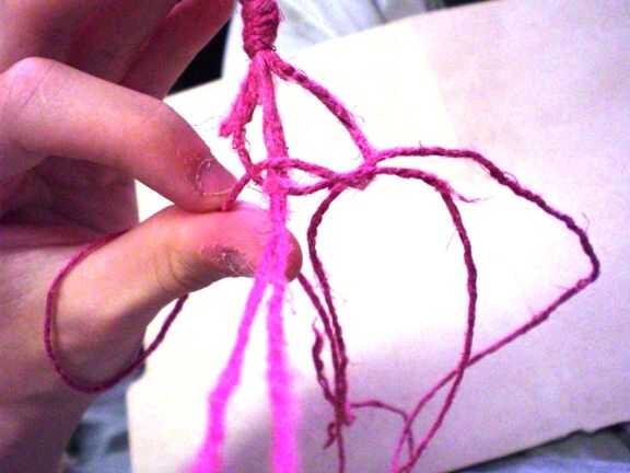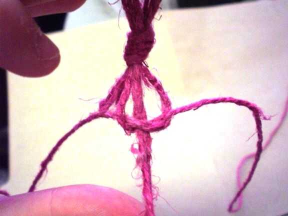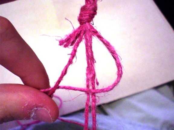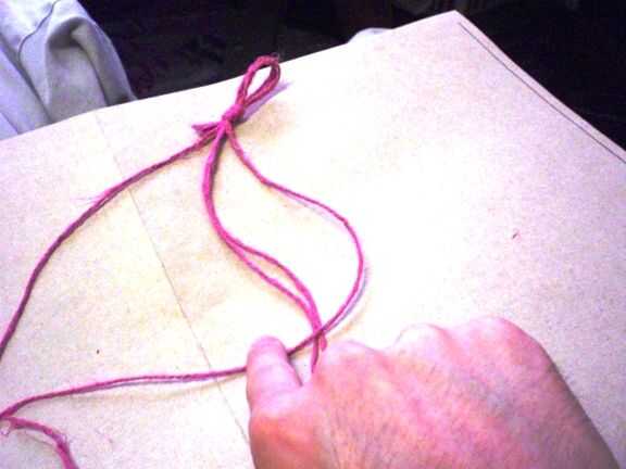 Tomar la hebra de socio (la otra larga se que no es el filamento principal) y colóquelo sobre la parte superior de la cadena principal. La tercera imagen muestra esto.
