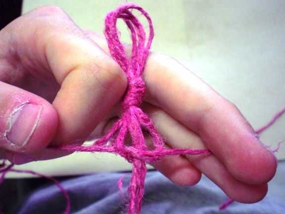 El nudo es simple. Sostenga el extremo con el bucle y las hebras medianas apretado y recto tirando un poco de ambos extremos. Esto se hace fácilmente si tienes el lazo atado a algo o celebrado entre le dedo medio y dedo anular. Luego, tirando de los hilos exteriores. Fotos 5 y 6.