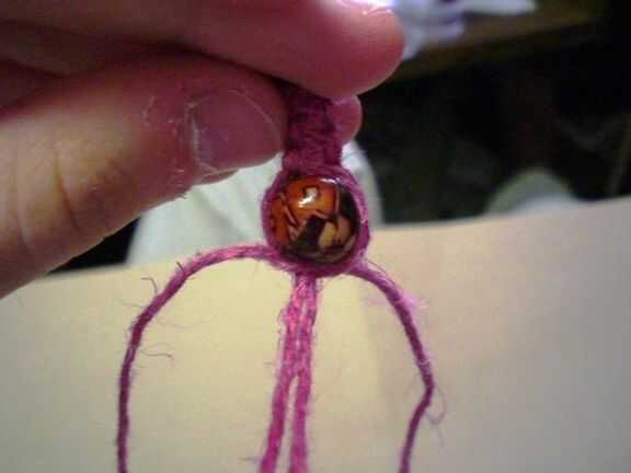 Por lo tanto, primero poner un grano en los filamentos del mediados. Entonces, un nudo cuadrado como lo haría normalmente, excepto que ahora hay un grano en los hilos del mediados. Ver fotos para una mejor explicación.