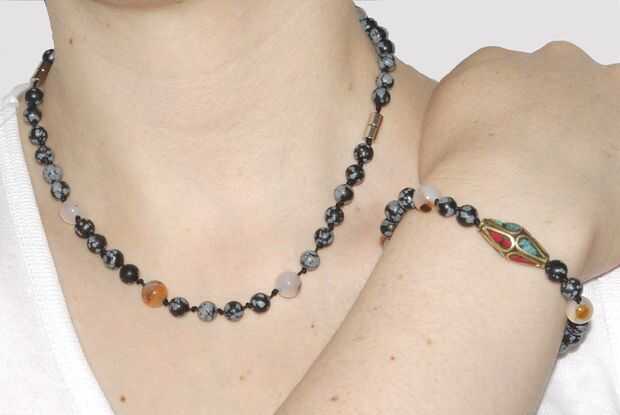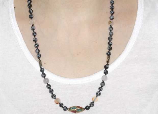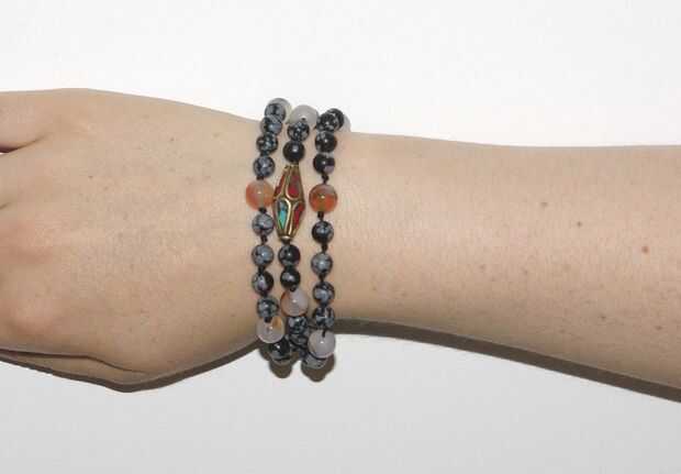 Puede ser usado como 3 pulseras, una pulsera y un collar (con ya sea la focal perla en el collar o en el braclet), o como un collar largo.