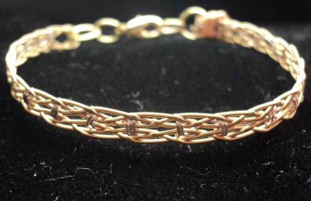 Esta es una de las primeras cosas que hice con cuerda de guitarra. Parece mucho más complicado de lo que es, es sólo dos tres trenzas, lado a lado, cosidos con alambre del filamento.