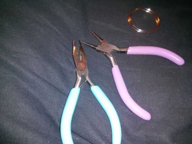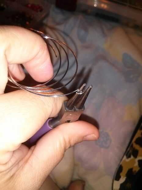 Ahora quieren utilizar la herramienta color púrpura para doblar el extremo del alambre memoria para hacer un pequeño lazo. Usé los alicates de punta (teal) para cerrar el ciclo. Este bucle evitará los granos resbale como agregarlos al alambre. Omitir este paso y no serás feliz.