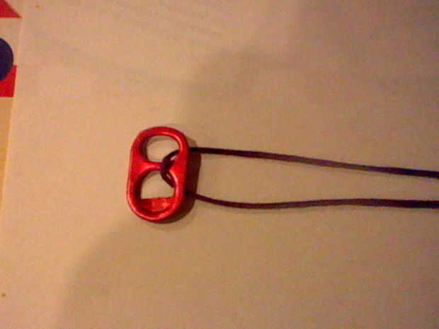 En primer lugar, tomar una lata ficha y su cadena. Poner los extremos de la cuerda en los agujeros de la ficha (uno de los extremos en cada una). Mirar la fotografía para ver cómo su supuesta a ir. Tire de los extremos de la cadena por lo que son.
