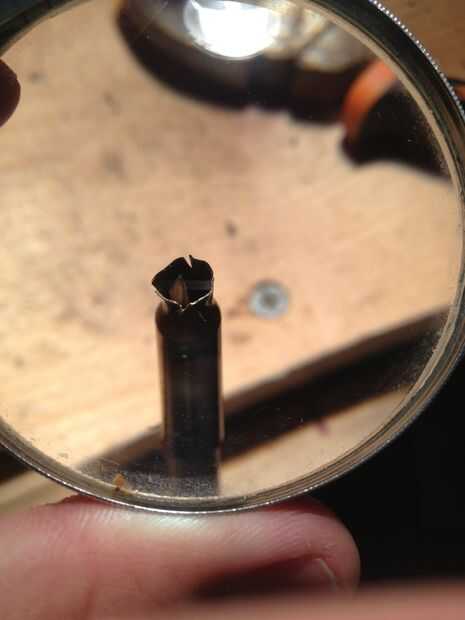 Bien, cuando se juntan las dos piezas, necesita girar la cáscara. Los dos puntos que prensó comenzará a cavar en la madera, asegurando al eje. Girar una o dos veces, tomar la cola de carpintero, o algún tipo de pegamento y viértalo en la parte abierta de la concha. Luego, termine de atornillar en el eje de la flecha. Óptimamente, usted quiere la madera punta de la flecha, ahora dentro de la cáscara, justo debajo de las aletas de cobre amarillo en la cáscara. Espere 5 minutos para empezar a secar el pegamento.