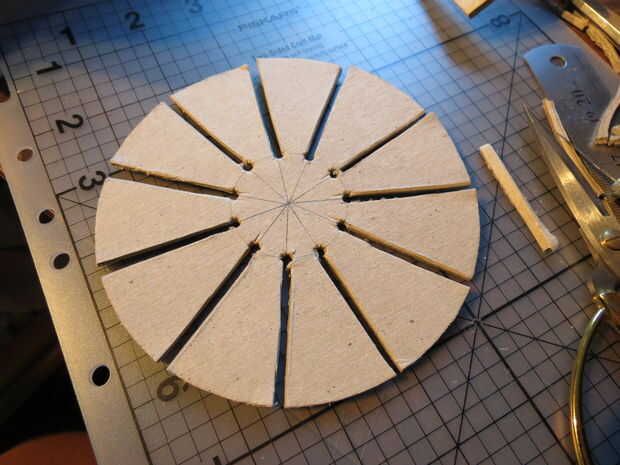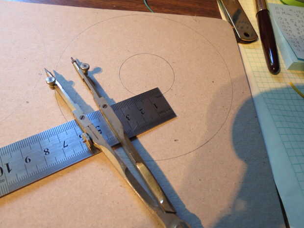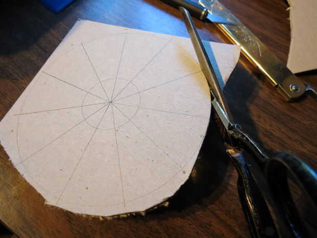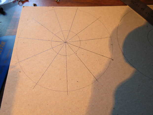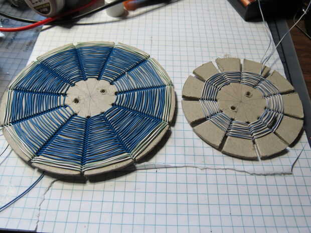 Las bobinas utilizadas en esta radio se devanan en bobinas de "tela de araña" del material de tablero duro interior de tapas de carpeta. Esto era sorprendentemente difícil de trabajar, y encontré que era más fácil de hackear las formas ásperas con una sierra de marquetería y luego refinar los círculos con unas tijeras fuertes. El gran disco es 6,5 cm (aproximadamente 2.5") en el radio y el disco pequeño tiene un radio de 4,5 cm (aproximadamente 1 3/4").