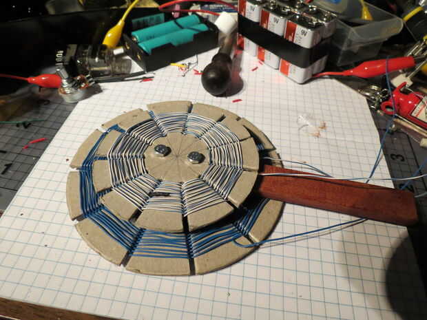 Enrollar las bobinas, simplemente comience en una ranura y vaya alrededor del círculo, metiendo el cable con una sección, bajo el siguiente, de nuevo y así sucesivamente. Herí a 45 vueltas en el gran disco de la bobina principal, seguido por otro 6 vueltas (de un diverso pedazo de alambre) para la bobina tickler. El pequeño disco tiene 15 vueltas y se utiliza para el acoplamiento de la antena (es la pequeña bobina conectada entre la antena y la tierra).