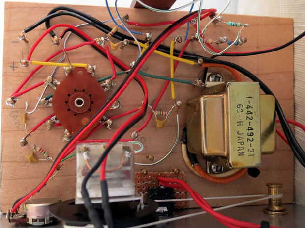 Una vez montado el tubo, marcar la configuración de pines del tubo en la placa que tener en cuenta que las hojas de datos lista el pinout como una vista inferior del tubo de. No recordar esto y como resultado por cable los pines del tubo hacia atrás. Por suerte tuve una segunda fila de pins en las zapatas de enchufe de tubo, por lo que acabo de cortar los cables pelados y cablear el zócalo del tubo, ahorrando un montón de tiempo.