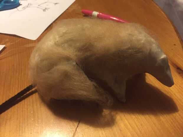 Utilizar la lana de mecha para añadir cabello al cuerpo. Para ello con los colores pertinentes para las partes correctas de las marcas del cuerpo de la rata. Vale la pena juntar las piezas a través del cuerpo con una aguja en unos pocos lugares para conseguir matas de pelo en su lugar, si esto no funciona entonces usar pegamento. Después de tener varias piezas de cabello asegurado puede utilizar su aguja de fieltrar a pelo garante a otras piezas de lana de mecha o sentido hacia abajo.