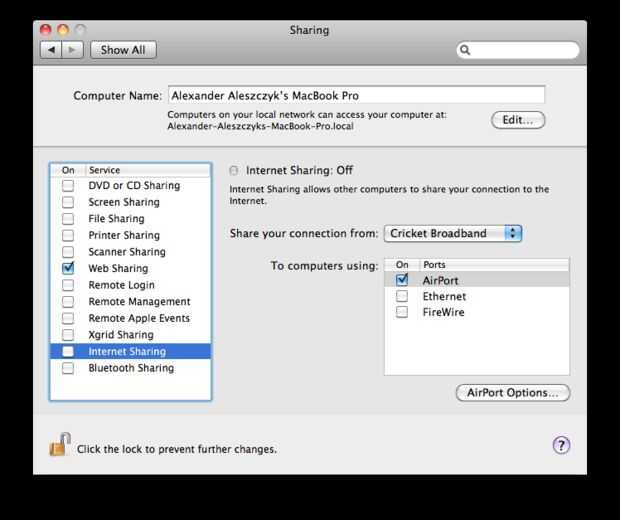 En el menú desplegable, seleccione banda ancha de Cricket y Compruebe la AirPort en la lista