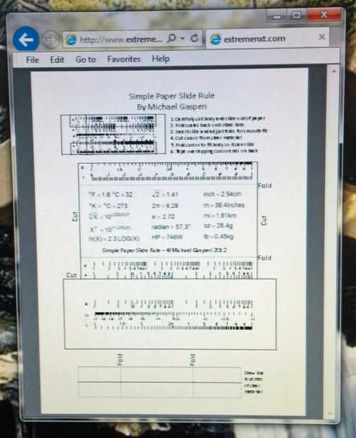 Necesita descargar la imagen PDF de la regla de diapositiva desde www.extremenxt.com/sliderule.pdf o desde el enlace de más abajo.  Imprimir la página en papel tan grueso como su impresora puede manejar.
