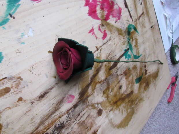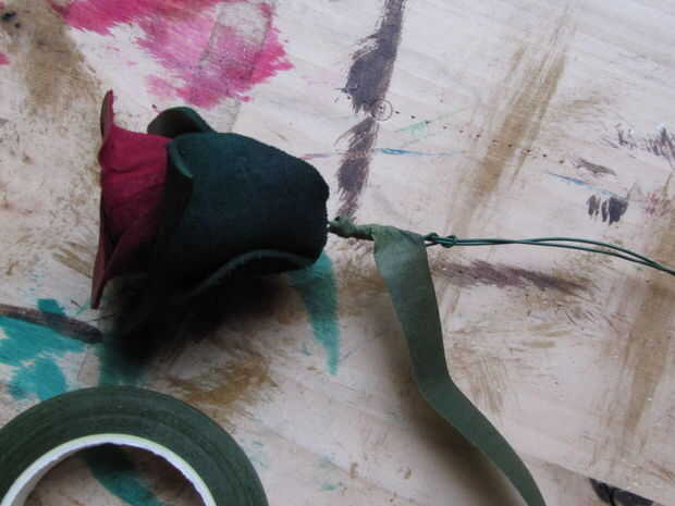 Tomar ti doble alambre floral y corte a la longitud. Tuerza el alambre de la rosa en la espiga. Use cinta floral para envolver todo el tallo 2 x.