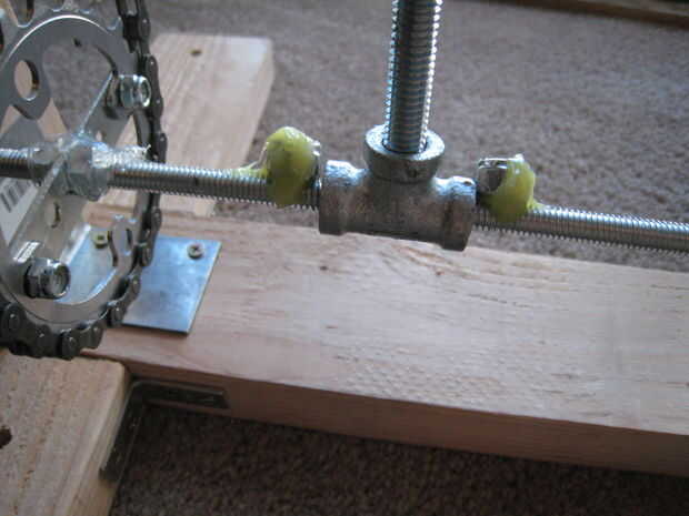A continuación, solía epoxy tuercas repuestas delante y detrás del conector T del pegamento. Estas tuercas se pegan encima de la varilla de 5/16 y fue hechas para evitar que el eje se mueva hacia adelante y hacia atrás demasiado.