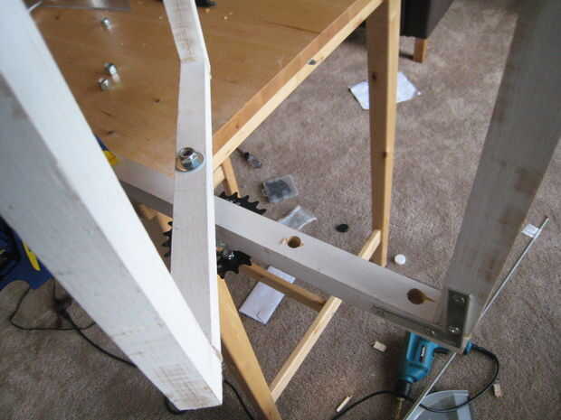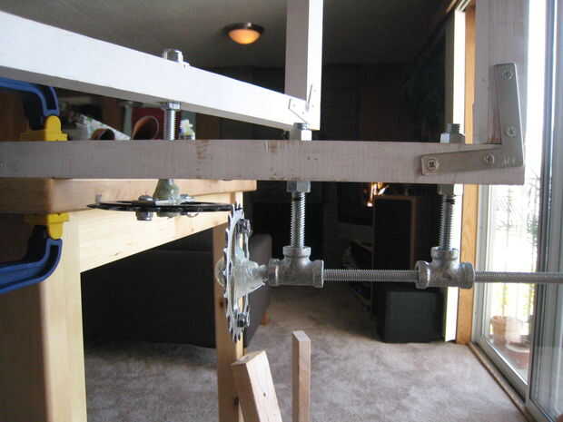 Ahora, es tiempo para probar cómo se alinean los engranajes. El árbol (el 8,5 pulgadas 5/16 barra) debe girar los engranajes colocados en cada extremo de la misma. El equipo más cercano al centro del marco grande, debe tener su línea de dientes para arriba con el equipo que está conectado (vía las 4.5 pulgadas de varilla de 5/16) para el pequeño marco. Los dos engranajes forman un ángulo recto. Si todo va bien, el eje debe girar y girar a su vez el engranaje, que se convierte el pequeño marco. Usted podría tener que hacer algunos pequeños ajustes aquí para cosas de trabajo.