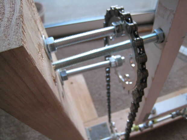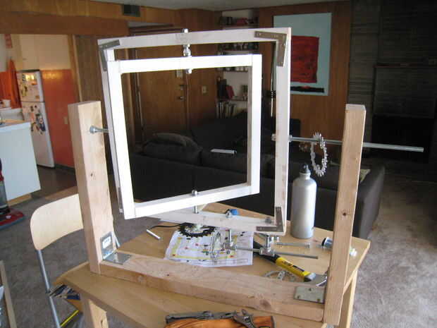 Ahora, sujete el lado derecho de marcos a la base. Deslice la varilla de 3/8 de 12 pulgadas a través del orificio en la parte exterior de 2 x 4 y en el orificio de 3/8 de pulgada de la barra grande, sin embargo, usted necesitará la barra para ir a través de la marcha, ya que será imposible montar en el lugar correcto si no lo hace. Después de haber asegurado la varilla de 3/8, necesita montar el equipo. Tomar las dos varillas de 5/16 de 4 pulgadas y deslizarse por los agujeros que ha perforado. Entonces libremente montar usando dos tuercas regulares.